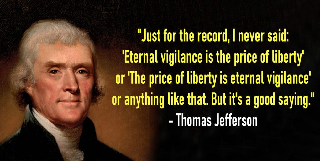 So, to quote the immortal words that Thomas Jefferson should have said: “Eternal vigilance is the price of liberty.”