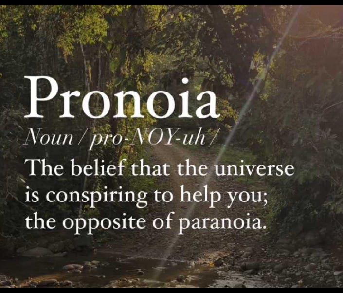 Is “pronoia” a real thing? My holistic wellness “Witch Doctor” says it describes me well. I call it just being a regular Floridian. But now I’m second guessing that I’ll meet a fabulous mate tonight who’s fascinated I’m so radically pronoiaic (sic?).