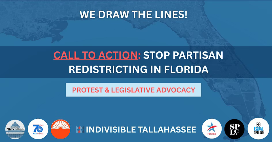 Indivisible, the same people who sponsored the No Kings Day rallies, are staging a series of actions in Tallahassee on Dec. 4 to protest efforts by Republicans to once again redraw the state’s congressional districts to make them more favorable for G.O.P. candidates. More information here: