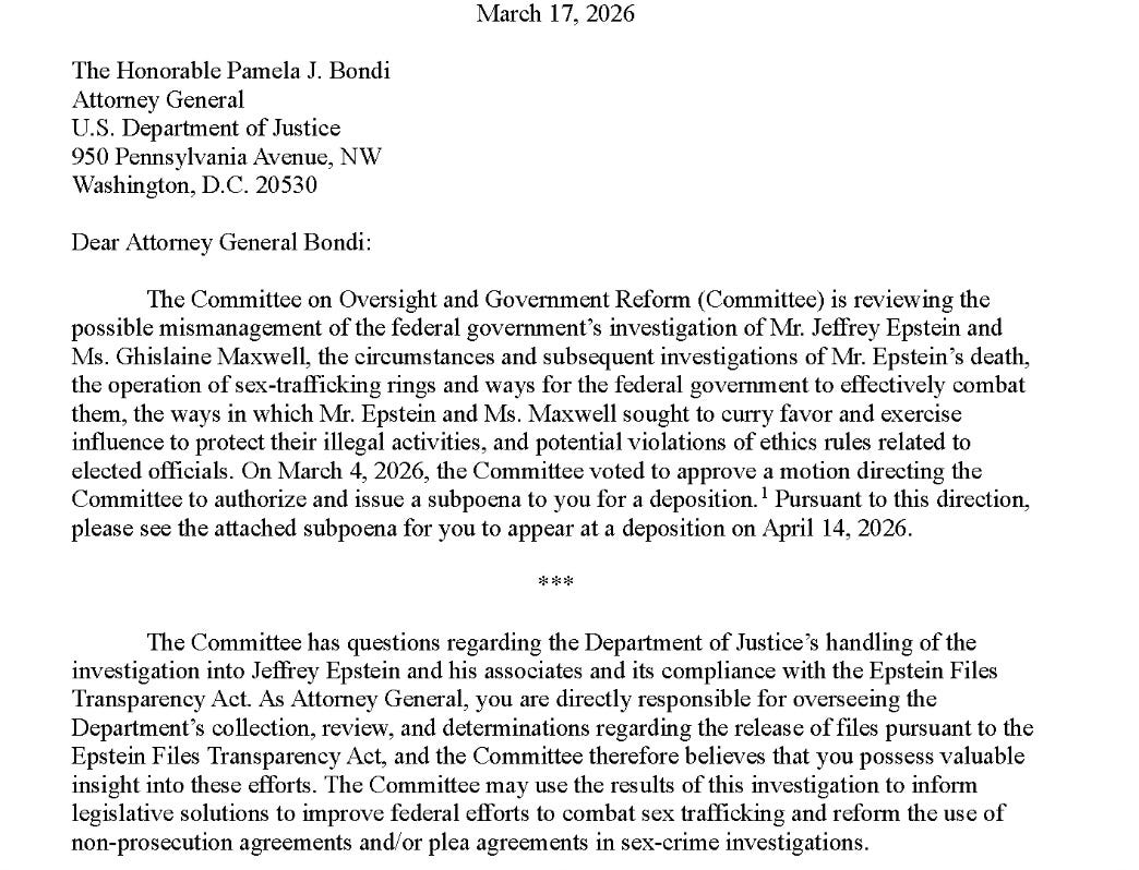 BREAKING NEWS: Pam Bondi subpoenaed to testify before Congress about Epstein Files
