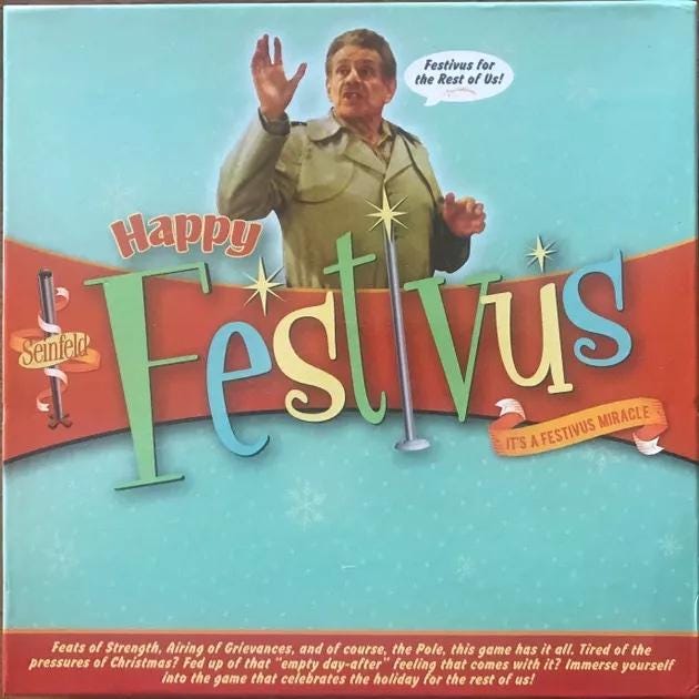 Festivus. Dec. 23 marks the date for this annual made-up holiday concocted by the family of Seinfeld writer Dan O'Keefe and aired as an episode of the show on Dec. 18, 1997. Created as a counterpoint to the excesses of Christmas, Festivus involves a plain aluminum pole (instead of a Christmas tree) and is a time for wrestling, meatloaf eating, and airing of grievances. What started as a joke has now become an international phenomenon.