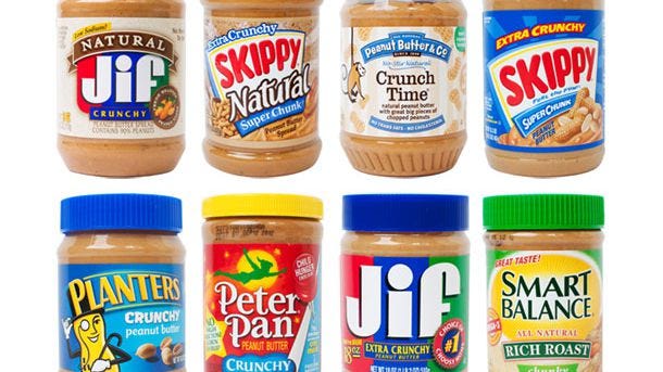 Jif and Skippy tied for first place as the clear favorites among poll respondents, each receiving 35 percent of the vote. Other -- meaning some brand not mentioned by name in the poll -- earned 15 percent. And Smart Balance, Planters and Peter Pan (my personal fave) garnered 5 percent each.