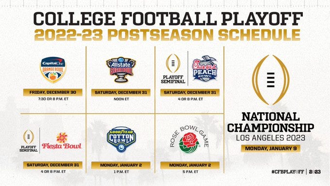 The month of December is packed with college football championship games and bowls culminating in New Years Eve's Peach Bowl, Sugar Bowl, Fiesta Bowl, and Music City Bowl. The remainder of the big bowl games roll over into Jan. 2, and the National Championship Game will be televised (ESPN) on Monday, Jan. 9.