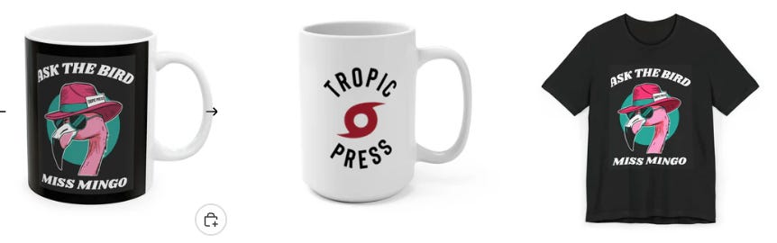 The official Tropic Press Store is now open and ready for business. You can order your very own Miss Mingo tee shirts and coffee mugs online. All sales are final. Check out the store here:
