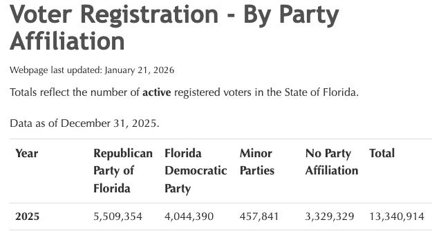 As you can see, Republicans are well ahead in the voter-registration race in Florida. Of the state’s 13.3 million registered voters, 5.5 million are Republicans and 4 million are Democrats. There are also another 3.7 million voters who are either members of minor parties or unaffiliated with any party.
