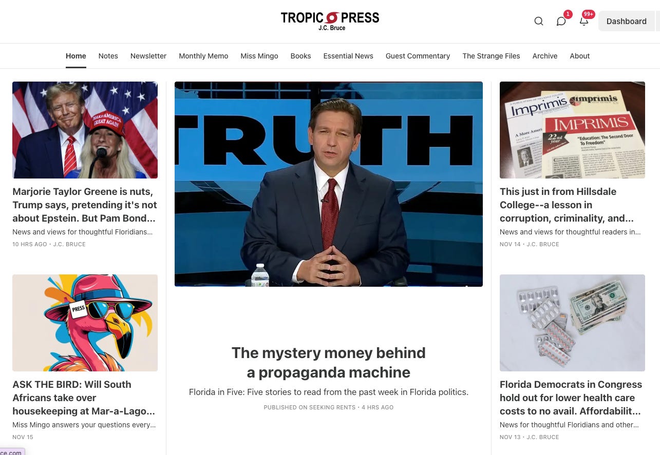 The closest thing Florida has ever had to an official state media outlet was an online “news service” called The Florida Standard. But there wasn’t anything standard about it. It was a propaganda machine funded by dark money at the behest of Gov. Ron DeSantis. Independent investigative journalist Jason Garcia has the story. You can find it on the Tropic Press website here: