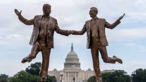 A statue of Donald Trump and Jeffrey Epstein, holding hand and frolicking, appeared overnight near the U.S. Capitol.