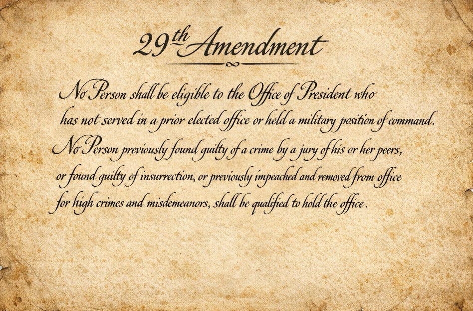 No more criminals as President! This amendment is intended to ensure that never again can an utterly inexperienced, grossly unqualified, completely unfit individual attain the power of the presidency. Never again should the American people face the prospect of a criminal candidate running—or governing—from prison. It simply says: criminals need not apply.