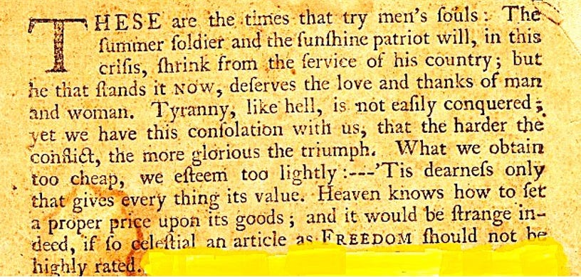 “THESE are the times that try men’s souls. The summer soldier and the sunshine patriot will, in this crisis, shrink from the service of their country; but he that stands by it now, deserves the love and thanks of man and woman. Tyranny, like hell, is not easily conquered; yet we have this consolation with us, that the harder the conflict, the more glorious the triumph. What we obtain too cheap, we esteem too lightly: it is dearness only that gives every thing its value. Heaven knows how to put a proper price upon its goods; and it would be strange indeed if so celestial an article as FREEDOM should not be highly rated.”