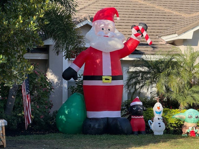 Well, aren’t you the little busybody! This is a little-known law in Florida, so as it turns out, your question is actually pertinent. Yes, there are height limitations. Inflatable Christmas decorations—Santa, snowpersons, reindeer, I’ve even seen some huge Mandalorians, whatever they have to do with the holiday season—are prohibited from being so tall that they interfere with Santa’s flight path, which can vary depending upon whether he is taking off or landing or how much eggnog he’s had to drink.