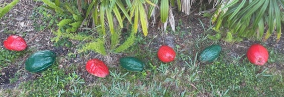 I noticed that some of my neighbors were painting their coconuts in Christmas colors. I decided I better take a picture. Is that legal?