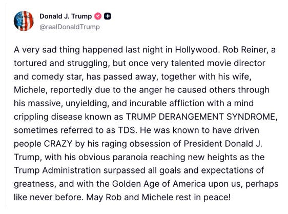 For those of us who consider "truth social" an oxymoron and never would have seen that particular sick rant, thank you for posting it. Unfortunately, the brain rot of the MAGA set, has progressed way beyond their ability to recognize reality. Trump would have to foam at the mouth and soil himself during a rally for them to suspect he might be off, and they will still rationalize it. He truly represents his base.