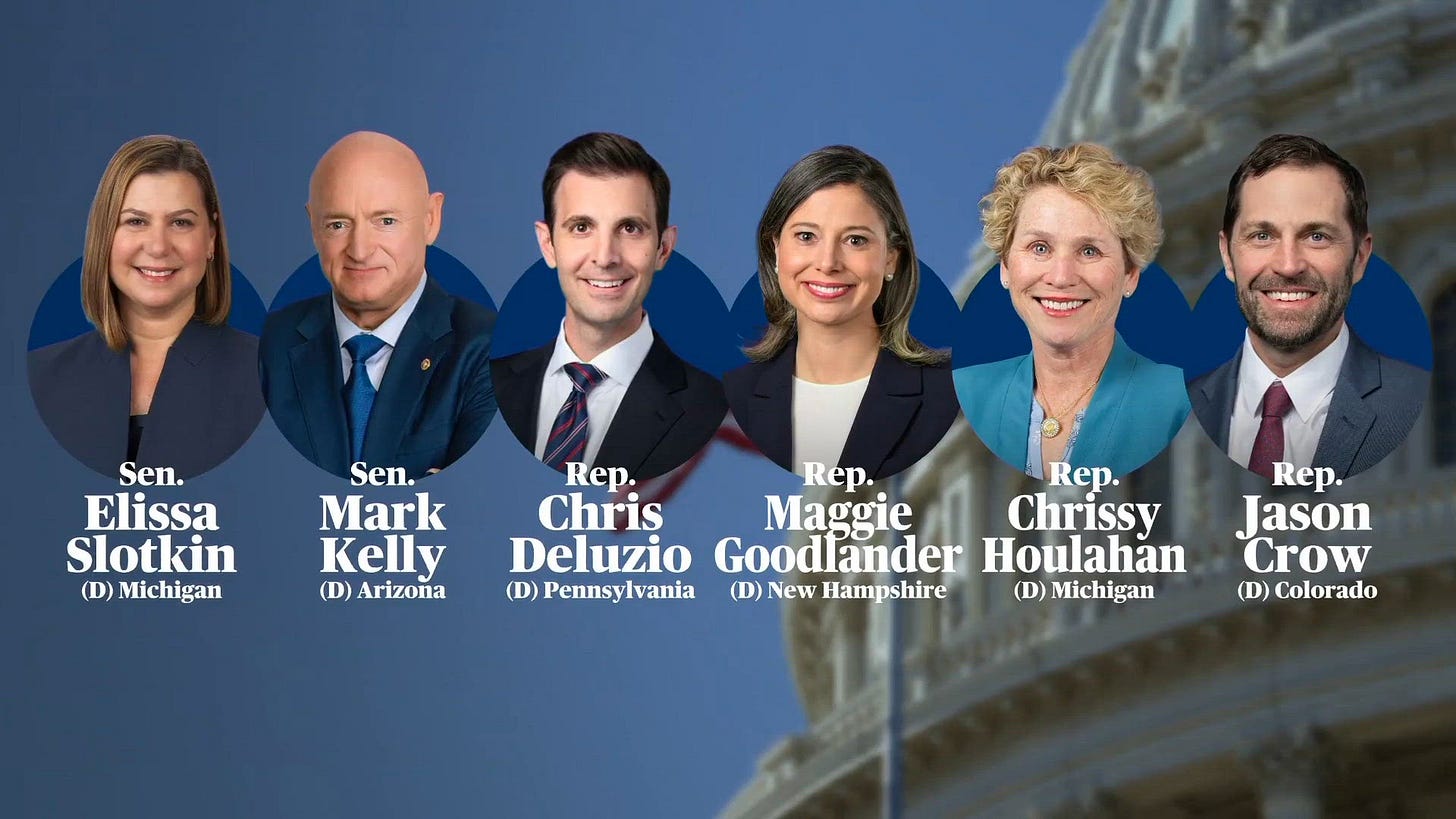 The group consisted of Senators Elissa Slotkin and Mark Kelly, and Representatives Jason Crow, Chris Deluzio, Maggie Goodlander, and Chrissy Houlahan. They released the video after Trump ordered a strike on Venezuela.
