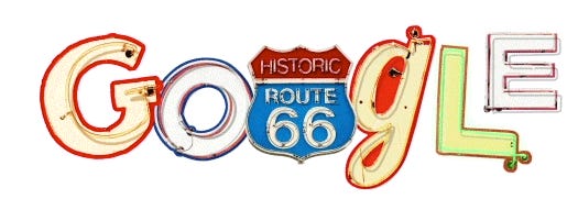 Whatever I had planned to scribble about evaporated immediately from my mind when I saw the curious Route 66 addition to the search engine’s logo.