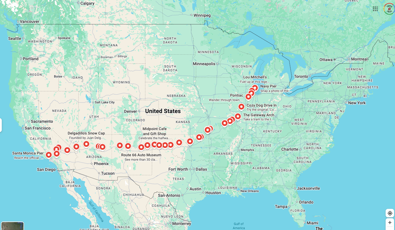 Those little red circles? If you launch Google and click on the clever Route 66 icon, it takes you to this interactive map where you can see some of the interesting stops along the way from the Midwest to the Left Coast.