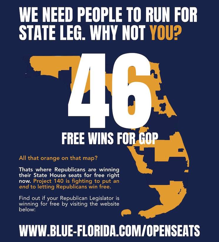 Consider the year 2000, when Florida was the epicenter of national controversy. The election between Vice President Al Gore and Gov. George W. Bush of Texas was so close that it ended up in the Supreme Court. By the time the court stopped the recount of ballots, Bush was ahead by only 537 votes. There were numerous uncontested legislative seats during that election giving Republicans easy wins. What if more Democrats had volunteered to run? Would those few extra votes have made a difference? It’s certainly possible.